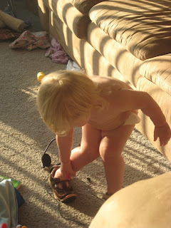The other night Miss Graycen was 'helping' me clean. We know how that goes. Well, she came out of her room wearing just a diaper and her shoes. She took off all of her clothes and put her shoes on. What a weirdo! Graycen found an old set of headphones in a box of stuff that I had pulled out of the closet. She kept trying to put them on. Eventually she got upset and came to David with them for help. She kept walking around the tripping on the cord, so David wrapped it around her waist and tucked the cord into her diaper.